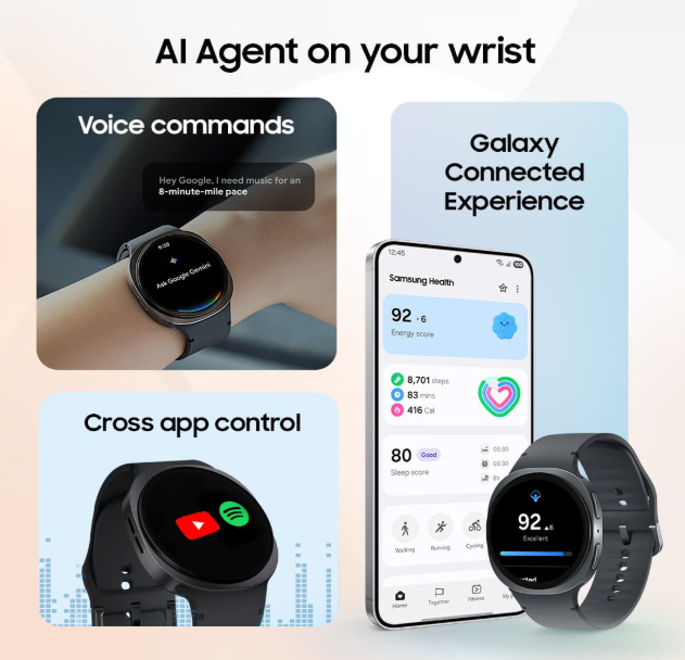 • AI Power with Gemini: This is powered by Wear OS 6 (with Samsung’s One UI 8) and is equipped with Google Gemini, allowing you to have an efficient AI voice assistant right on your wrist for routines and queries.