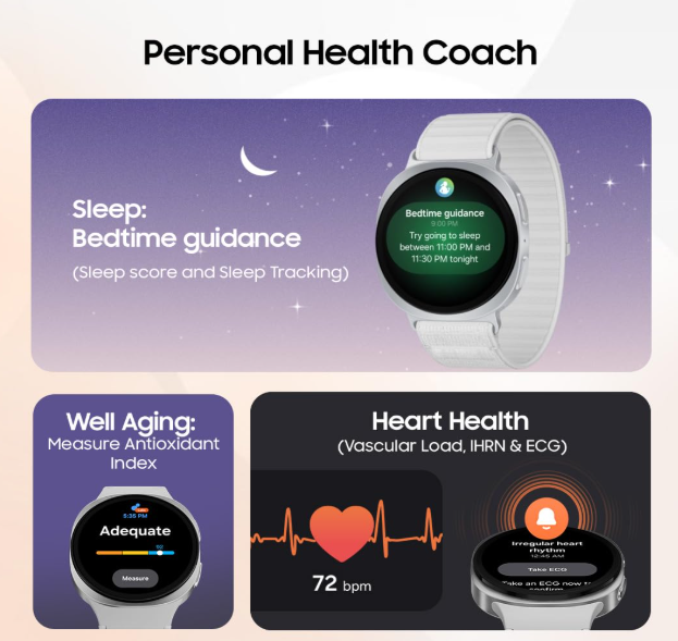 • The watch is equipped with a comprehensive health suite that includes the sensors for ECG, BIA (body composition), and new health metrics like the antioxidant index and vascular load.